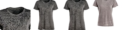 4 oz., 50% cotton, 50% polyester burnout jersey; Acid-washed with silicone finish; Self-fabric collar;