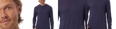 8 oz., 52% airlume combed and ringspun cotton, 48% poly fleece, 32 singles; Athletic Heather 90% airlume combed and ringspun cotton, 10% poly fleece; Fashionable and functional unisex hood for men and women; Remarkably soft, features a sporty crossover hood; Designed for optimal layering; Dyed-to-match drawcords; Raglan sleeves; Side-seamed; Tear away label;