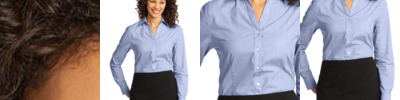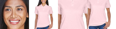 6.2 oz. preshrunk 100% cotton piqué; Feminine fit; Taped neck and side vents; Half-moon patch; Slender placket; Dyed-to-match buttons;