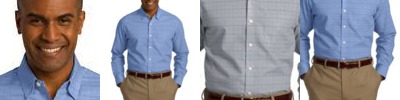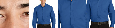 3.4 oz., 55% cotton, 45% polyester broadcloth; true non-iron performance straight from the dryer; stain release finish; fine yarn count shirting with pearlized buttons; patented pucker-free taped seams; specially fused collar, cuffs and placket; split back seam with bias cut back yoke; classic fit for professional appearance; rolled button-down collar; adjustable "Comfort Collar" gives up to an inch stretch at neck; left-chest pocket;