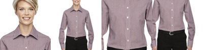 3.4 oz., 55% cotton, 45% polyester; Fine yarn count shirting; True Non-iron performance straight from the dryer; stain release finish; Patented pucker-free taped seams; Fused collar cuffs and placket; Split back seam with bias cut back yoke; pearlized buttons; straight collar; front and back princess seams for a flattering feminine fit; bust darts for a flattering feminine fit;