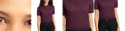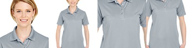 100% polyester heathered wicking knit top body, collar and sleeves ; 100% polyester wicking knit solid bottom body ; Wicks moisture away from the body ; Ladies' fit ; Pad print label ; Contrast self-fabric Johnny collar, placket, and yoke ; Contrast set-in sleeves ;