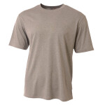 100% polyester heather tee, 4.2 oz. per square yard; Odor resistant and stain release fabric for easy care; Moisture management for all season comfort; Neck seam cover-stitched for extra durability; Tag-free neck;