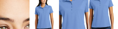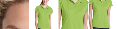 4.1 oz/yd² / 139 gsm, 100% polyester piqué with moisure-wicking, anti-microbial and UV protection performance; Matching flat-knit collar; Four-button narrow placket for feminine look; Side slits;