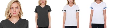 4.3 oz., 52% cotton 48% polyester; 30 singles; Ultra-Fine Cotton Blend; Fashion fit; Side seams; Varsity stripes on sleeves; Sporty look; Tear-away label; Made in a W.R.A.P. certified factory;