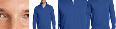 100% polyester heathered wicking knit top body, collar and sleeves ; 100% polyester wicking knit solid bottom body ; Ladies' fit ; Pad print label ; Quarter-zip pullover style; Self-fabric collar ; Set-in sleeves ;